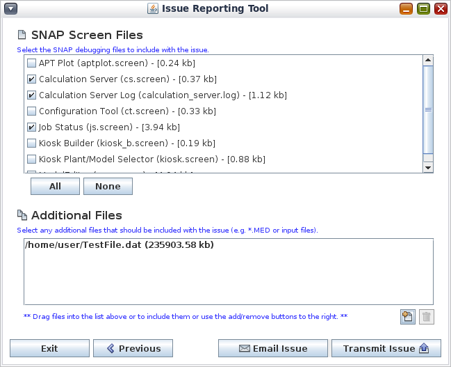 The tool will collect a set of SNAP debug and log files from the machine that it is run on. It is important to run the tool on the same machine that encountered the error and that it be run immediately after the issue is encountered. SNAP debug files are generally overwritten each time the application opens. As shown below, the tool will provide a list of all debug and log files that it finds. You can choose to exclude any of these files prior to submitting the report.